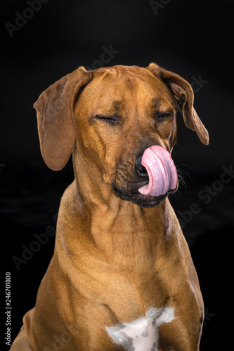 Portrait Rhodesian Ridgeback dog isolated black background sitting licking nose