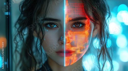 woman, technology, humanity, digital artwork, portrait, expression, confidence, high technology, realism, glowing, symmetric, detail, cinematic, mask, personality, fusion, pattern, feature, eye, bright, creativity, modern, innovation, aesthetic, portraiture, duality, representation, artistry, visualisation, high-coloured, ambience, character, emotion, design, identity, future, surreal, captivating, intriguing, contrast, beauty, cybernetic, inspiration, symbolic, engaging, stylish