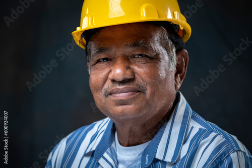 Portrait smiling of senior engineer wearing yellow helmet looking at camera on the dark background in studio.
