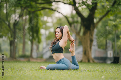 Portrait sport asian beauty body slim woman in sportswear sitting relax and girl practicing yoga and do fitness exercise in park at home.Diet