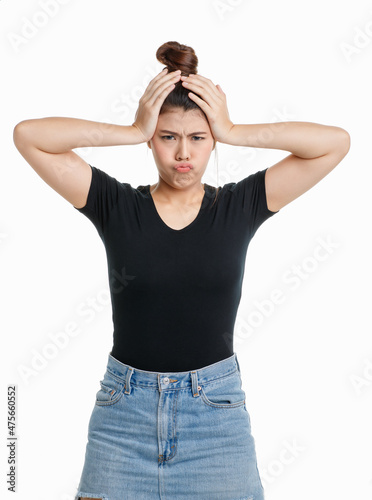 Portrait studio shot of Asian upset worried nervous stressed headache bun hairstyle female model in black shirt and denim skirt standing holding hands cover head look at camera on white background