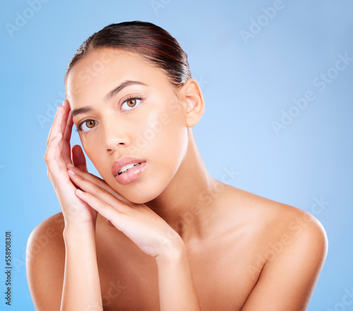 Portrait, woman and skincare on studio blue background for beauty salon, body makeup and cosmetics. Young model, face headshot and natural glow of luxury facial, aesthetic wellness and healthy shine