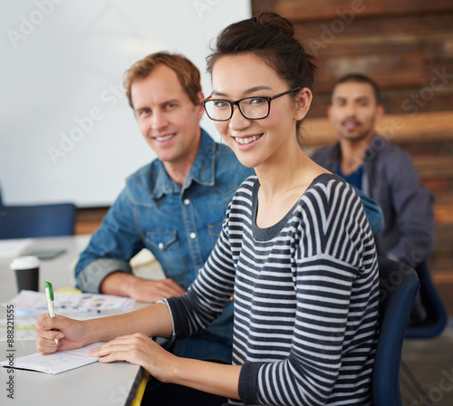 portrait, woman, writing, notebook, business, office, team, meeting, modern, planning, book, company, startup, business meeting, strategy, development, meet, conference room, administration, agenda, female, young, people, group, adult, smiling, working, work, goggles, person, table, together, desk, creative, men at work, teamwork, professional, job, designer, paper, collaboration, employee, entrepreneur, content, note, workplace, paperwork