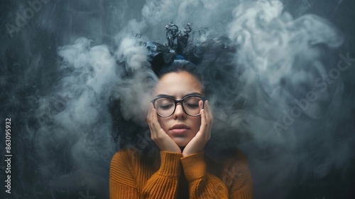 Portrait young stressed woman thinking too hard steam coming out up of head isolated on grey wall background Face expression emotion perception : Generative AI