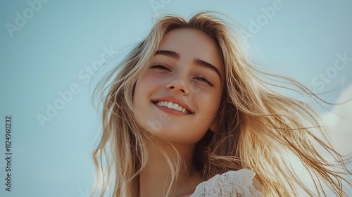 female, curly hair, gentle, fashion, beautiful, temperament, portrait, photo, closeup, natural light, model, girl, smile, bust, photograph, woman, hair, beauty, blond, coiffure, person, lady, people, skin, long, studio, eye, style, sensuality, lip, 1, glamour, face