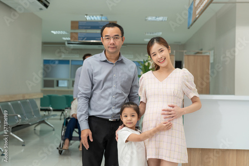 Portriat of happy family asian Pregnant middle aged mother, father and daughter at the hospital. Medical healthcare and healthy pregnancy concept.