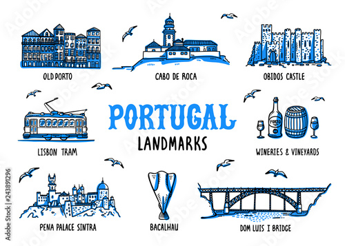 Portugal landmarks set. Handdrawn sketch style vector illustration