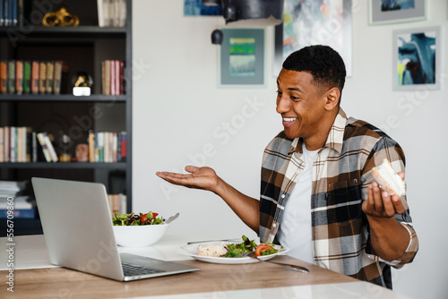 man, male, young, adult, mid, african, afro, american, black, smile, joyful, gesture, ravenous, food, computer, laptop, tasty, salad, vegetable, lunch, meal, dinner, rest, eat, kitchen, home, room, lifestyle, casual attire, plaid, shirt, 1, day