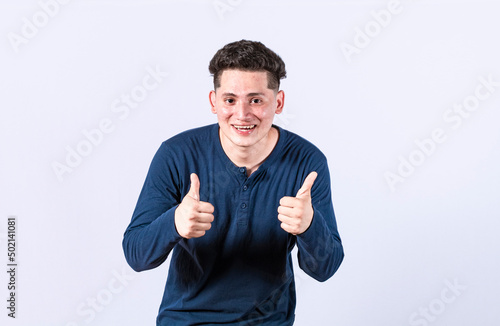 Positive guy with thumbs up doing ok, young man with thumbs up on white background, Smiling man showing ok gesture looking at camera
