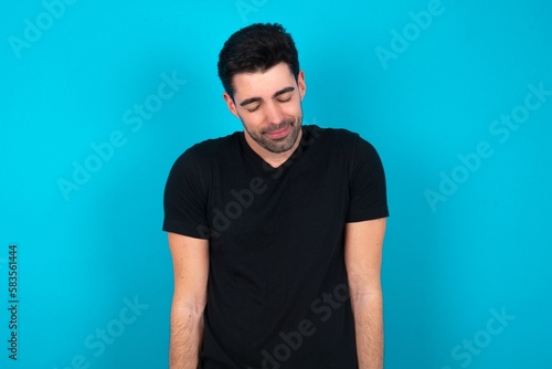 Positive Young man wearing black T-shirt over blue studio background with overjoyed expression closes eyes and laughs shows white perfect teeth
