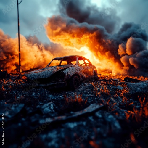 apocalypse, car, wrecked, burning, city, fire, smoke, destruction, disaster, chaos, devastation, ruin, abandoned, damaged, vehicle, flames, inferno, catastrophy, wasteland, surreal, dramatic, dark, moody, gritty, end of the world, emergency, emergency services, crisis, climate change