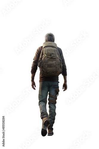 Post apocalyptic dystopian survivor old senior mature man walking away. Full view. Standing, Back rear view. Isolated transparent PNG background. Ideal for book covers, movie posters and much more.