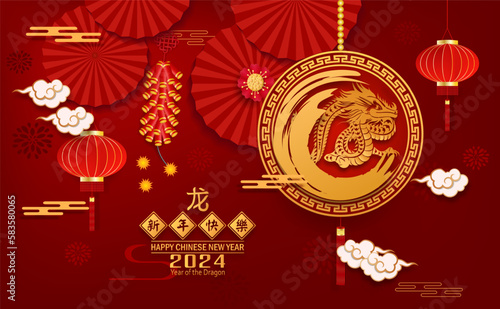 Post card for Happy chinese new year 2024 Year of Dragon. Charecter with asian style. Chinese is mean Happy chinese new year.