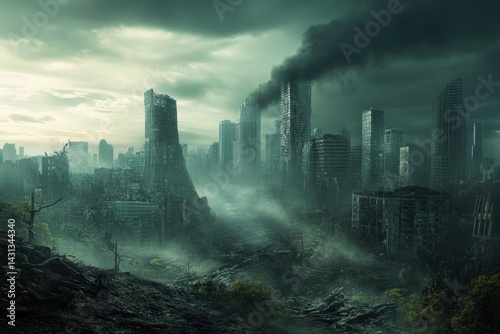 Post-apocalyptic cityscape with ruined skyscrapers under stormy sky