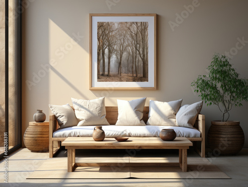 Poster Wall Mockup in beige interior with white sofa, Mockups Design 3D, High-quality Mockups, Generative Ai