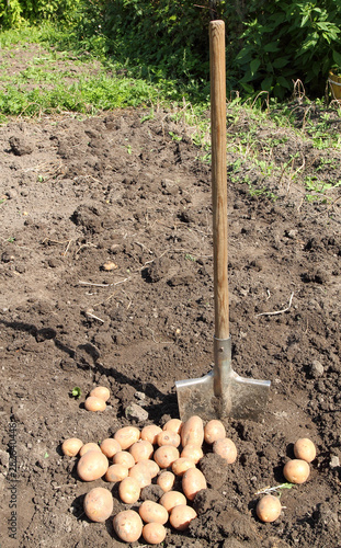 tuber, potato, fresh, harvest, garden, agriculture, vegetable, picking, harvesting, crop, cultivating, growing, shovel, stuck, land, plot, bungalow, summer, day, sunny, dirtied, nature, field, ground, farm, earth, food