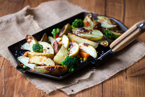 potato, wedge, chips, pea, carrot, broccoli, pepper, spice, food, corn, farm, roasted, healthy, vegetable, cabbage, meal, slice, grilled, baked, herb, flavouring, cooked, carbohydrate, gold, spicey, grill, portion, roast, pan