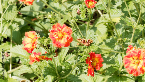 potentilla, potentilla, hybrid, flower, yellow, gold, orange, tuft, foliage, green, rosaceae, blosson, summer, flora, floral, flower, garden, plant, nature