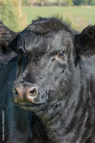 cow, closeup, cattle, farm animal, angus, agriculture, animal, autumn, beef, black, business, calf, countryside, detail, domestic, farm, farming, farmland, field, food, grass, graze, grazing, green, head shot, heifer, mammal, meadow, meat, milk, nature, organic, pasture, portrait, ranch, rural, summer