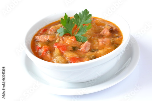 courgette, gourd, goulash, squash, vegetable, soup, isolated, sausage, meat, pepper, leaf, parsley, tomatoes, sausage, meal, dish, appetiser, bowl, dish, cooking, food, dinner