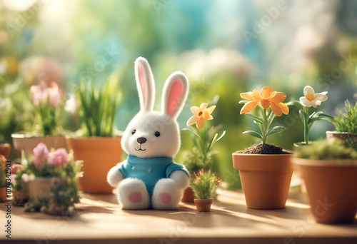 potted flowers vector bird cartoon nature print children seamless bunny illustration sunny curved flower background fictional pattern design easter lines plants bear characters