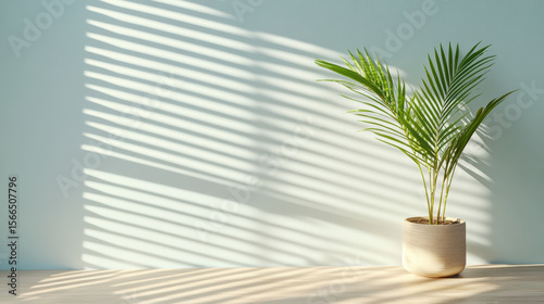 Potted plant casts beautiful shadows on light wall, creating serene atmosphere