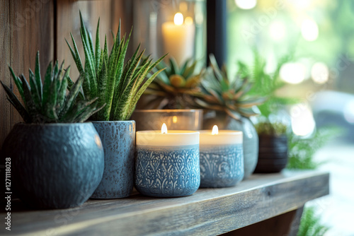 plant, candle, pot, nature, relaxation, interior, wood, window, light, flames, shelf, greenery, home, cosy, warm, ambience, arrangement, vase, leaf, pottery, indoor, style, natural, atmosphere, peaceful, succulent, detail, soothing, environment, freshness, calmness, elegance, simplicity, comfort, aesthetic, mood