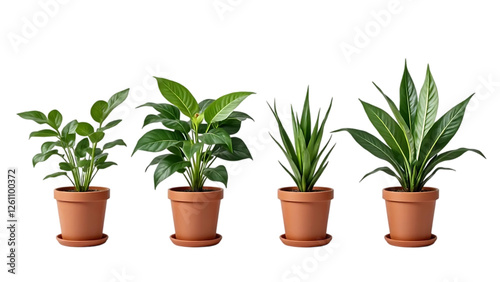 potted plants with varied greenery sit in terracotta pots implying nature concept in eco home
