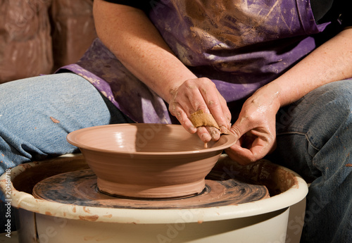 potter, artist, clay, earth, earthenware, turn, throwing, pot, bowl, shape, shaping, tool, wood, hand, form, art, messy, dirty, wet, spin, rotate, smock, apron, ceramic, jean, artisan, skill, craft, profession, woman, female, pottery, clothes, disrobed, drip