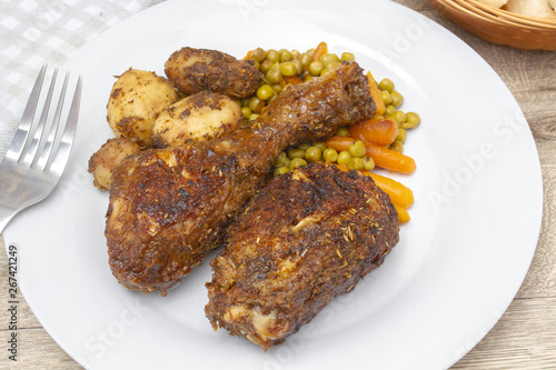 chicken, roaster, grass, spice, piece, thigh, meat, vegetable, potato, pea, pea, carrot, meal, dish, cooked, food, fowl, delicious, grilled, plate