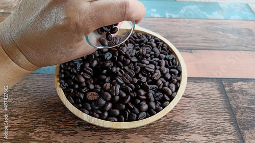 Pouring coffee beans from a glass bottle onto a wooden plate.