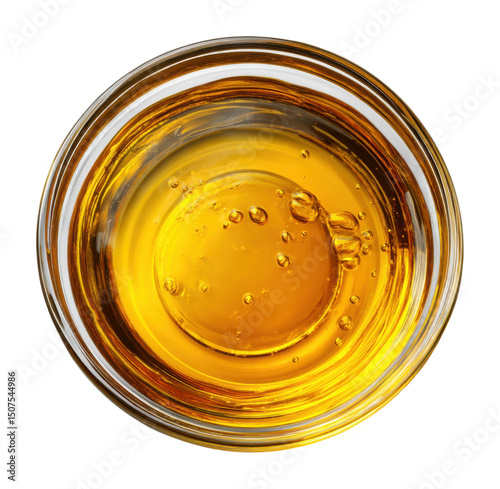 Pouring golden liquid into clear glass bowl home kitchen beverage bright isolated on transparent background