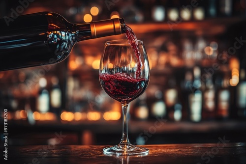 Pouring red wine from bottle into the wineglass on bar Red wine pouring from bottle to glass with generative ai