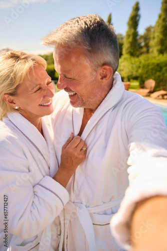 couple, senior, senior, retired, retirement, outdoors, spa, relaxing, pampering, treat, lounger, pool, swimming pool, selfie, celebrate, happy, smiling, fun, woman, woman, female, man, man, male, people, person, together, caucasian, 60s, 60s, holiday, vacation, well-being, wearing, robe, vertical, loving, romantic, hotel