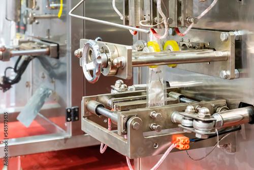 powder product in transparent plastic bag during sealing by vertical and horizontal sealer unit component of automatic filling packing machine for goods or food in manufacturing process