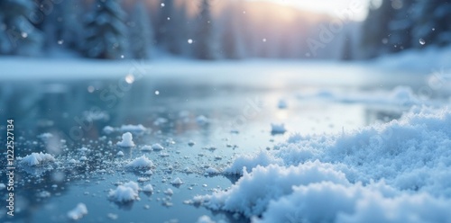 powdery flakes gently falling on a frozen lake, winter landscape, peacefulness, frozen lake