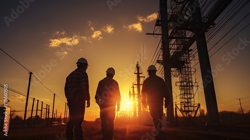 Power Industry Team: engineers surveying a power tower and substation at sunset, symbolizing dedication and progress