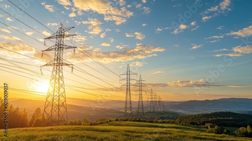 sunset, power, line, electricity, landscape, nature, energy, hill, cloud, sunlight, rural, scenery, skyline, transmission, tower, green, field, sky, scenic, environment, summer, aerial, horizon, peaceful, view, bright, illumination, dramatic, photo, tranquil, background, technology, utility, sunrise, dawn, evening, contemporary, skyward, pole, rural area, electrical, infrastructure, natural
