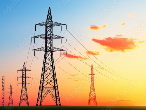 power, line, tower, electricity, sunset, transmission, cable, energy, grid, pylon, landscape, horizon, cloud, sky, colourful, vibrant, nature, dramatic, silhouette, metal, tall, structure, wire, technology, infrastructure, modern, rural, daylight, evening, light, colours, view, transmission line, industrial, electrical, pole, field, grass, communication, maintenance, safety, green, orange, red, pink, blue, weather, calm, peaceful