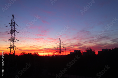 sunset, electricity, power, sky, energy, electric, pylon, tower, industry, cable, line, silhouette, orange, sunrise, voltage, industrial, sun, evening, steel, wire, high, electrical, construction, landscape, powerline, city, cloud, antennae, morning, background, light, technology, blue, bright, pink, structure, nature, shape, white, beautiful