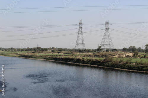 Power lines on the Yamuna river near Agra in Uttar Pradesh, India