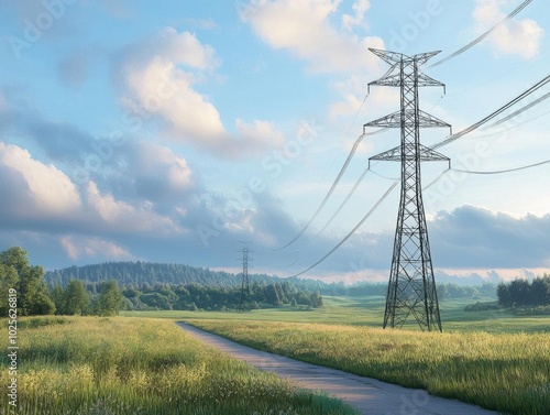 Power Lines Through a Rural Landscape: A Tranquil Scene of Nature and Infrastructure