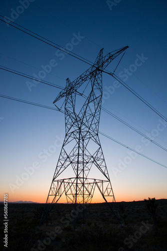 arid climate, backlit, california, color image, desert, dusk, electricity pylon, nobody, outdoors, photo, powerline, silhouette, sunset, tower, us, vertical