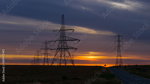 pylon, electricity, power, grid, infrastructure, energy, transmission, wire, tower, metal, structure, industrial, utility, network, engineering, voltage, supply, technology, landscape, countryside, moor, remote, yorkshire, britain, england, rural, sky, horizon, sunrise, sunset, electric lines, cloud, nature, powerline, scenic view, connectivity