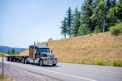 Powerful big rig black semi truck with grille guard going up hill with empty flat bed semi trailer in gorgeous Columbia Gorge area