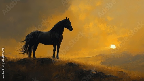 powerful black stallion standing proudly atop a hill, its glossy coat reflecting the golden rays of the setting sun