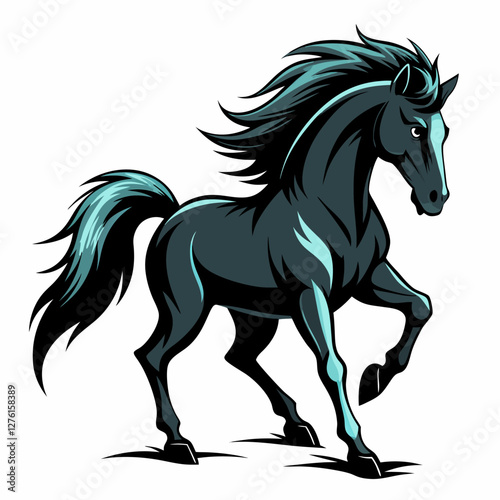 horse, teal, dark, equestrian, vector, graphic, powerful, pose, mane, tail, flowing, majestic, elegant, strength, freedom, animal, mustang, mythical, fantasy, logotype, branding, illustration, design, print, wild, energy, speed, spirit, nature, wildlife, muscular, athletic, dynamic, noble, proud, fast horse, fierce, grace, power, black, blue, turquoise
