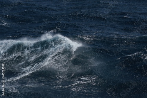 powerful ocean wave crashing in deep blue waters, showcasing raw beauty of nature. dynamic movement evokes sense of energy and tranquility