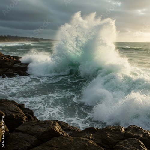 wave, ocean, water, sea, rock, coast, nature, splash, spray, foam, white, blue, green, turquoise, dramatic, powerful, energy, movement, dynamic, light, sunlight, sunrise, sunset, sky, cloud, landscape, seascape, coastal, stone, cliff, shore, beach, wild, texture, power, natural, beauty, scenic, vibrant, amazing, spectacular, breathtaking, photo, image, photo