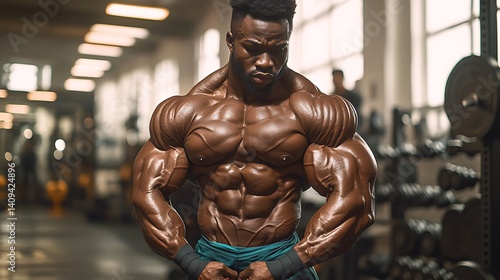 bodybuilder, male, physique, muscle, strength, fitness, gym, physical exercise, training, exercise, power, muscular, toned, defined, abs, chest, shoulder, arm, bicep, triceps, ripped, focused, determined, dedication, health, wellness, lifestyle, protein, nourishment, diet, gain, result, motivation, inspiration, sculpted, posture, pose, posing, dark, skin, athletic, intense, serious, concentration, routine